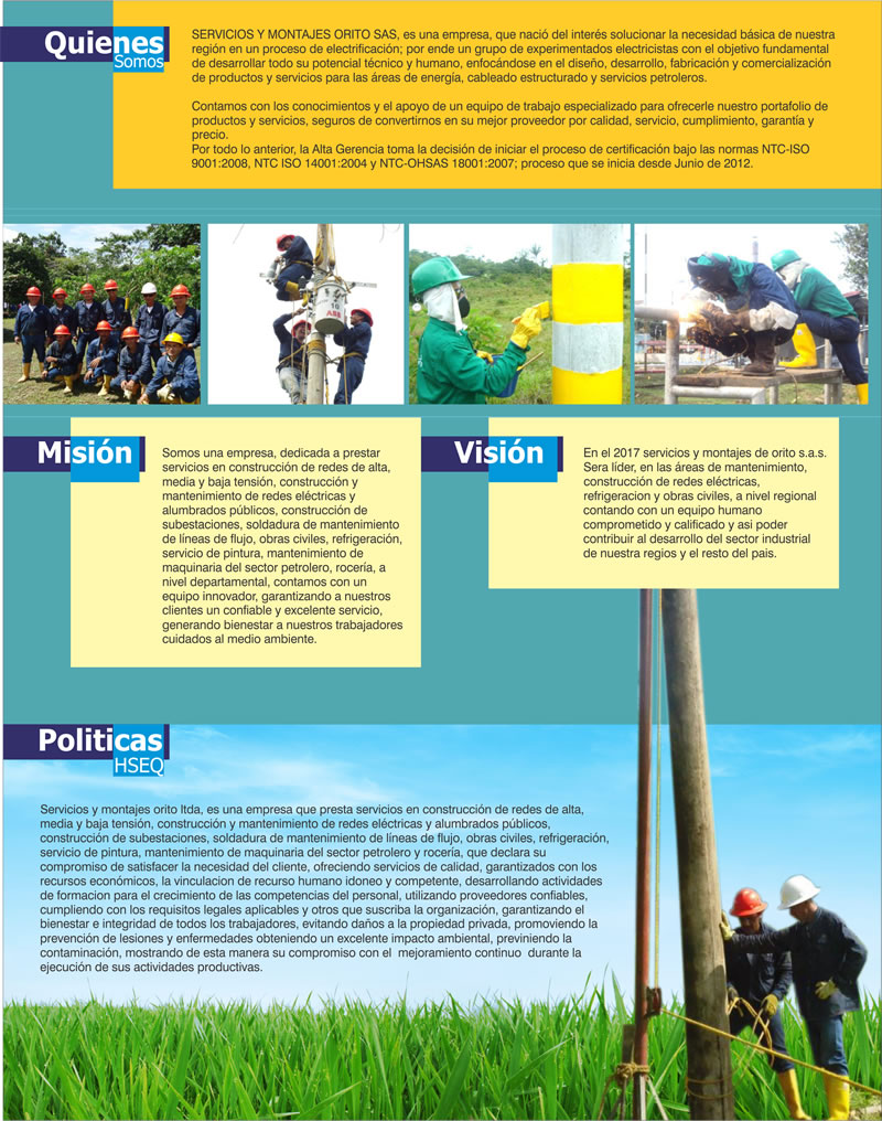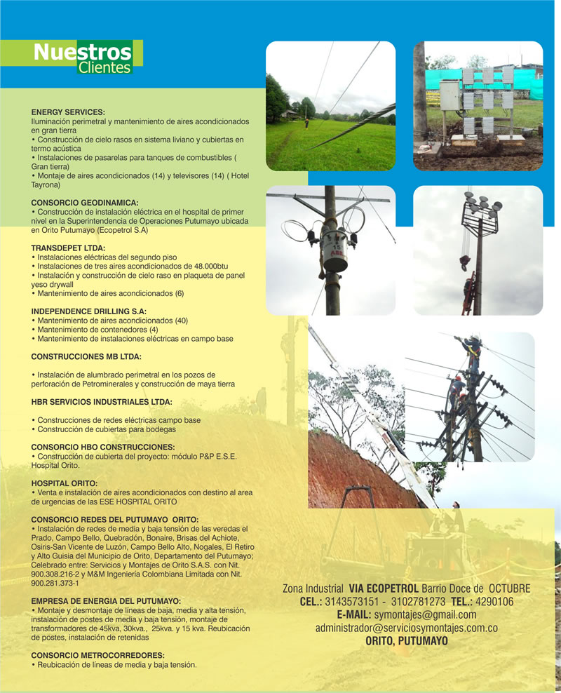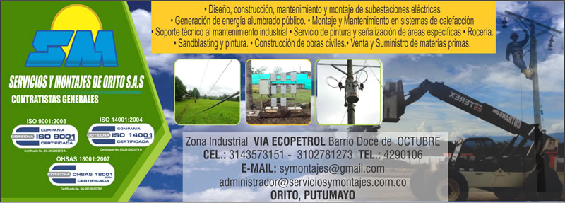 Zona Industrial VIA ECOPETROL Barrio Doce de OCTUBRE CEL.: 3143573151 - 3102781273 TEL.: 4290106 E-MAIL: symontajes@gmail.com administrador@serviciosymontajes.com.co ORITO, PUTUMAYO |